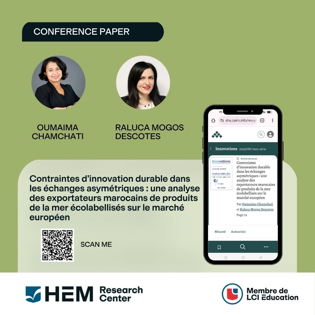 Le HEM Research Center annonce la présentation d’un article coécrit par Oumaima Chamchati, chercheure au sein du centre, et Raluca Mogos Descotes, professeure de marketing international à l’Université du Littoral Côte d’Opale, lors du Forum Innovation organisé par le Réseau de Recherche sur l’Innovation (RRI), qui se tient du 13 au 16 octobre 2025 à l’EDC Paris.